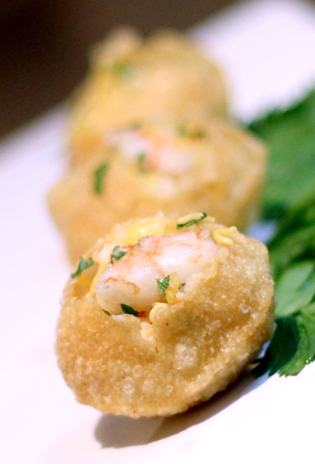 To Serve: Break a hole in each puri and stuff with the sweet corn filling. Top with sev, followed by celery leaves and a piece of prawn.