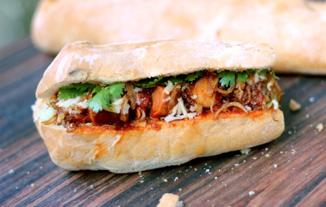 Sometimes inspiration strikes when you least expect it. When it does, a Tex-Mex influenced appetizer gets stuffed into an Italian bread and is garnished with very Asian fried onions, fried garlic and fresh coriander. And the entire jumble results in a rather, rather tasty sandwich.