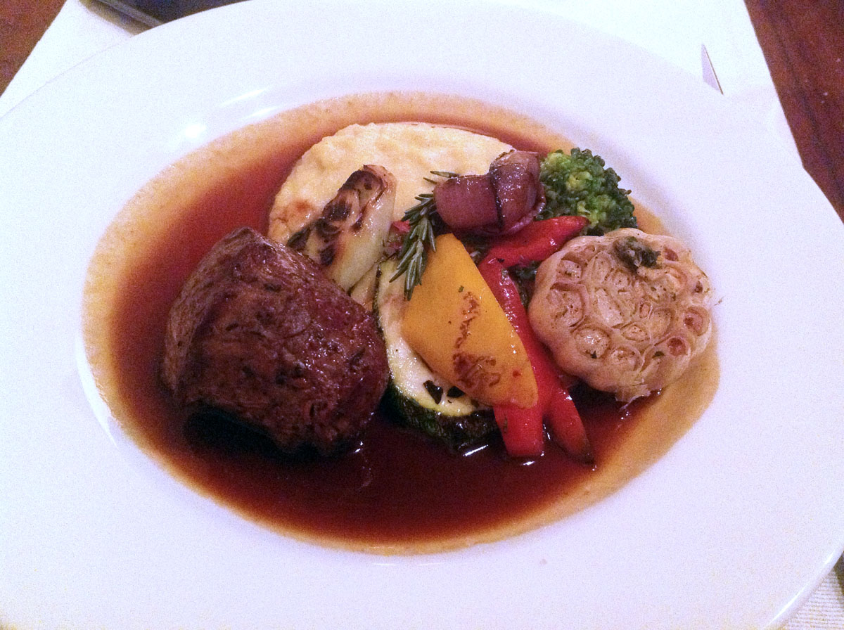 Mixed feelings about this one. The filet mignon was perfectly cooked medium-rare, but the meat was a bit chewy; the mashed potatoes and the roasted head of garlic was fabulous.