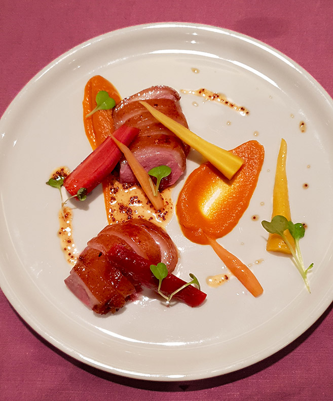 I find the 21-day, wet-aged, duck is as plump, juicy and fatty as a pork chop with an equal rich depth of flavour. The assiette of carrots and carrot puree add a touch of crunch.