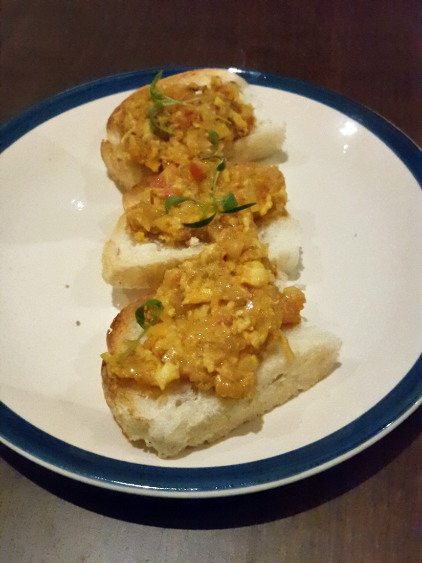 Toasts – Topped with Kekda Masala The Bombay Canteen, Mumbai Share this: Share on LinkedIn (Opens in new window) LinkedIn Share on Pinterest (Opens in new window) Pinterest Share on Tumblr (Opens in new window) Tumblr Email a link to a friend (Opens in new window) Email Print (Opens in new window) Print Share on WhatsApp (Opens in new window) WhatsApp More Share on Telegram (Opens in new window) Telegram Share on Facebook (Opens in new window) Facebook Share on X (Opens in new window) X Like Loading...